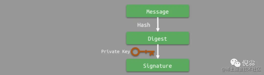 签名生成由通信中的发起方进行,过程如下图所示。首先对通信内容进行哈希,然后使用发送方的私钥进行加密,最终得到签名。