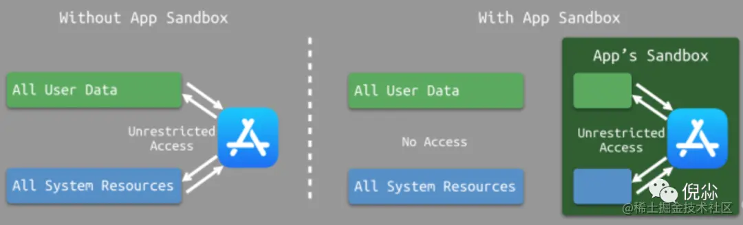 沙盒(Sandbox)技术是iOS 安全体系中非常重要的一项技术,它的目的是限制App的行为,比如:刻度写的路径、允许访问的硬件、允许使用的服务等等。因此,如果代码出现bug,也不会影响沙盒外的系统。