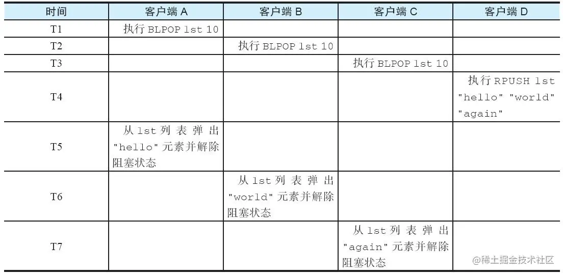 如果在同一时间,有多个客户端因为同一个列表而被阻塞,那么当导致阻塞的列表变为非空时,服务器将按照“先阻塞先服务”的规则,依次为被阻塞的各个客户端弹出列表元素。