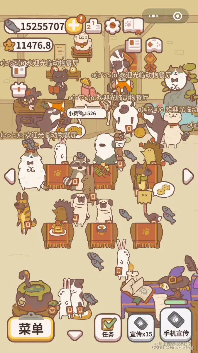 动物餐厅的核心方法非常简单,玩家只需通过不断点击招募按钮来招募客户,然后客户吃饭、付钱,就是这样一个简单的场景。玩家通过奖励的小鱼干,可以解锁动物餐厅里面的一些餐厅设施,不断的装潢自己的餐厅,来达到提升星级的目的,就像一个米其林三星大厨一样。