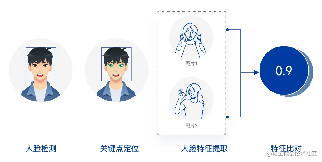 主要使用深度学习等方法提取人脸的特征,然后通过特征对比,计算人脸的相似度。