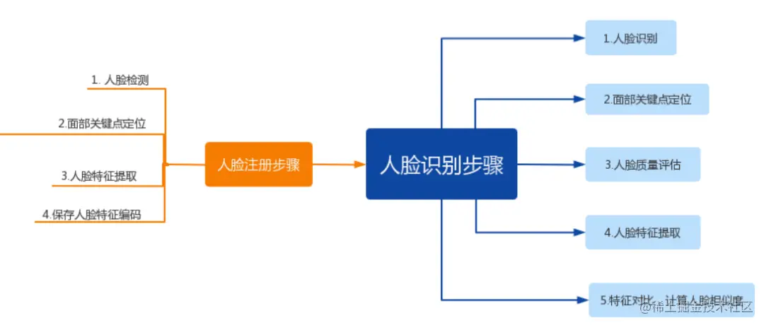 从上面人脸识别的流程图可以知道人脸识别主要包含2个大块:人脸注册和人脸识别。