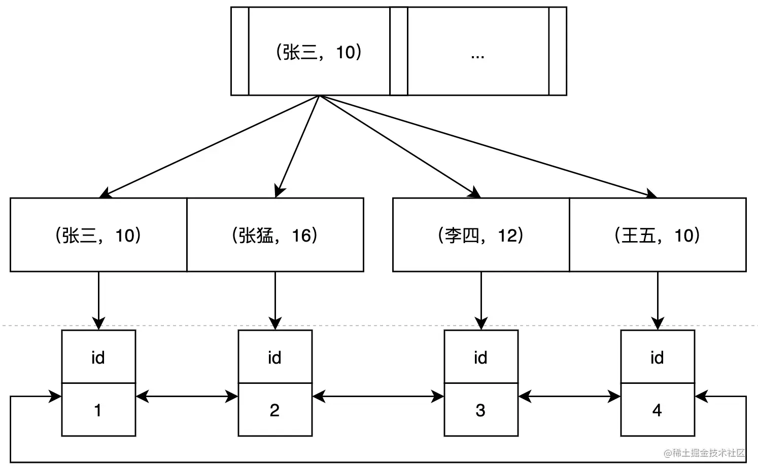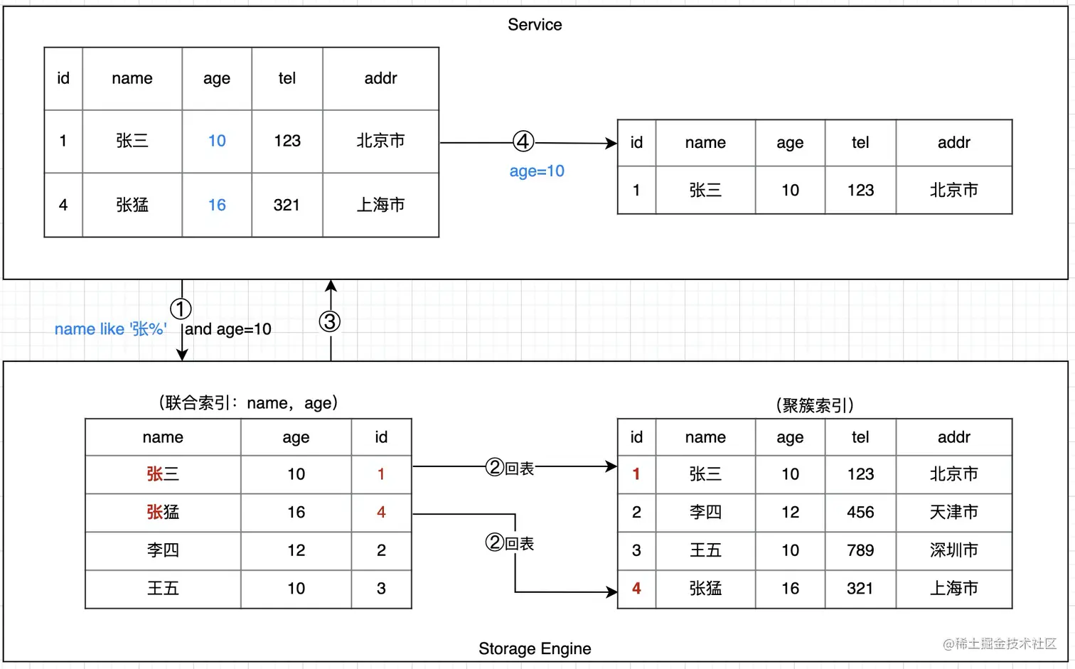 在 MySQL 5.6 之前,存储引擎根据联合索引先找到 name like ‘张 %’ 的主键 id(1、4),再逐一进行回表扫描,去聚簇索引找到完整的行记录,返回 server 层,server 层拿到数据后,再根据条件 age=10 对拿到的数据进行筛选。大致的示意图如下: