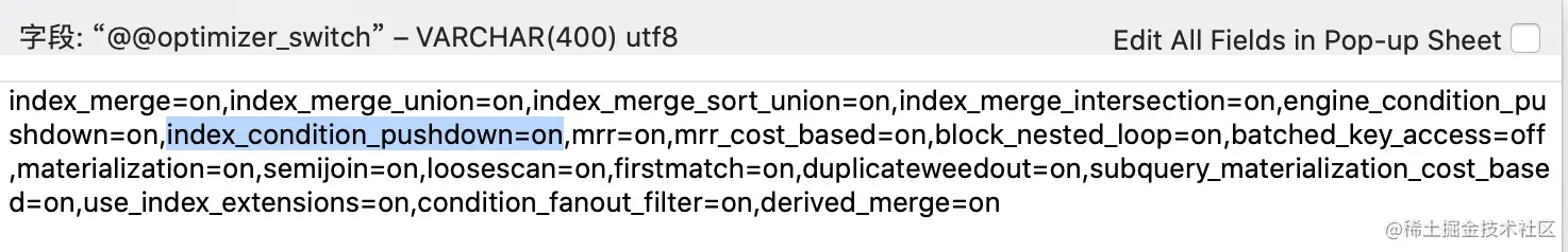 Mysql 索引下推功能默认是开启的,可以用系统参数 optimizer_switch 来控制是否开启。