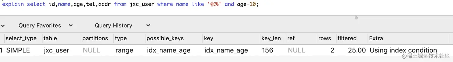 除此之外我们还可以看一下执行计划,看到 Extra 一列里 Using index condition,就是用到了索引下推。
