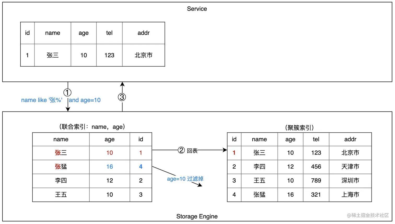 而 MySQL 5.6 以后, 存储引擎会根据(name,age)联合索引,找到 name like ‘张 %’,由于联合索引中包含 age 列,所以存储引擎直接再联合索引里按照条件 age=10 进行过滤,然后根据过滤后的数据再依次进行回表扫描。大致的示意图如下:
