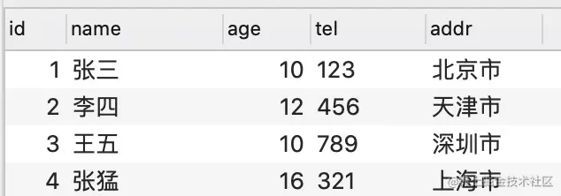 select id,name,age,tel,addr from jxc_user where name like '张%' and age=10;