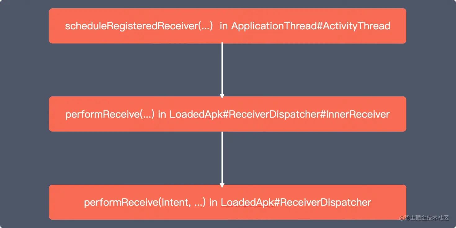 首先会调用 ActivityThread#ApplicationThread 类中 scheduleRegisteredReceiver 方法,最终会调用 LoadedApk#ReceiverDispatcher 类中的 performReceive 方法。