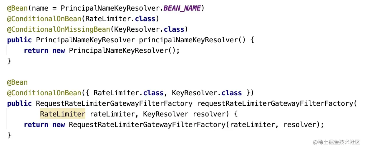 GatewayAutoConfiguration默认提供了一个KeyResolver的实现PrincipalNameKeyResolver,基于java.security.Principal#getName获取限流资源key,在案例中我们使用ExampleKeyResolver替换了默认实现。