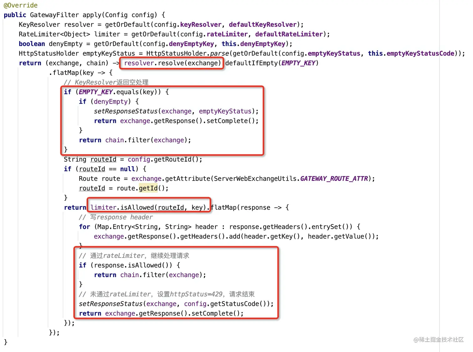 总体上分为两步,第一步KeyResolver解析key,第二步RateLimiter限流判断。