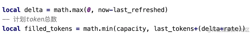 计算计划令牌数量filled_tokens=未填充时间长度delta*填充速率rate+剩余token数量last_tokens,最大不超过桶总容量capacity。