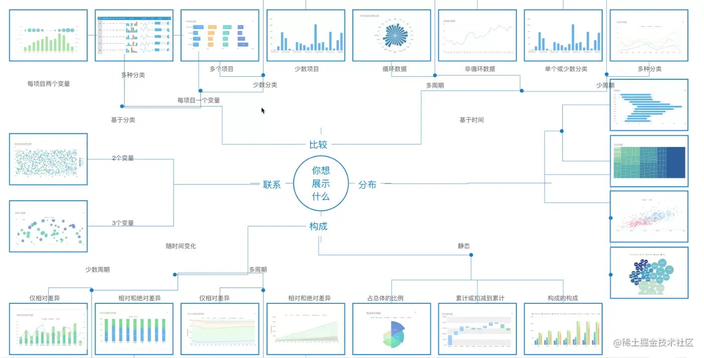 我这边给大家分享一个图表选择的图片,大家根据使用的对比、进度、关系等需求,来选择合适的图表。