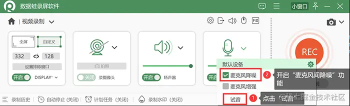 (注:如果需要录制电脑系统声音则需要打开“扬声器”,如果是需要录制电脑外人物说话声音,则需要打开“麦克风”。点击“麦克风”右侧的小箭头,可以选择“试音”或者是打开“麦克风降噪功能哦”)
