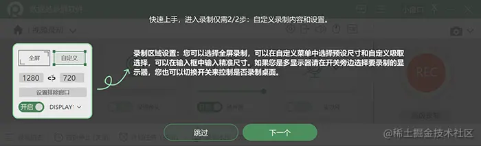 **步骤2:**进入基础设置界面后,第一次使用,可以根据【新手指引】的界面,在录制开始前依次对录屏的区域、排除窗口、摄像头、扬声器、麦克风等进行设置,最后点击【REC】即可开始录制。