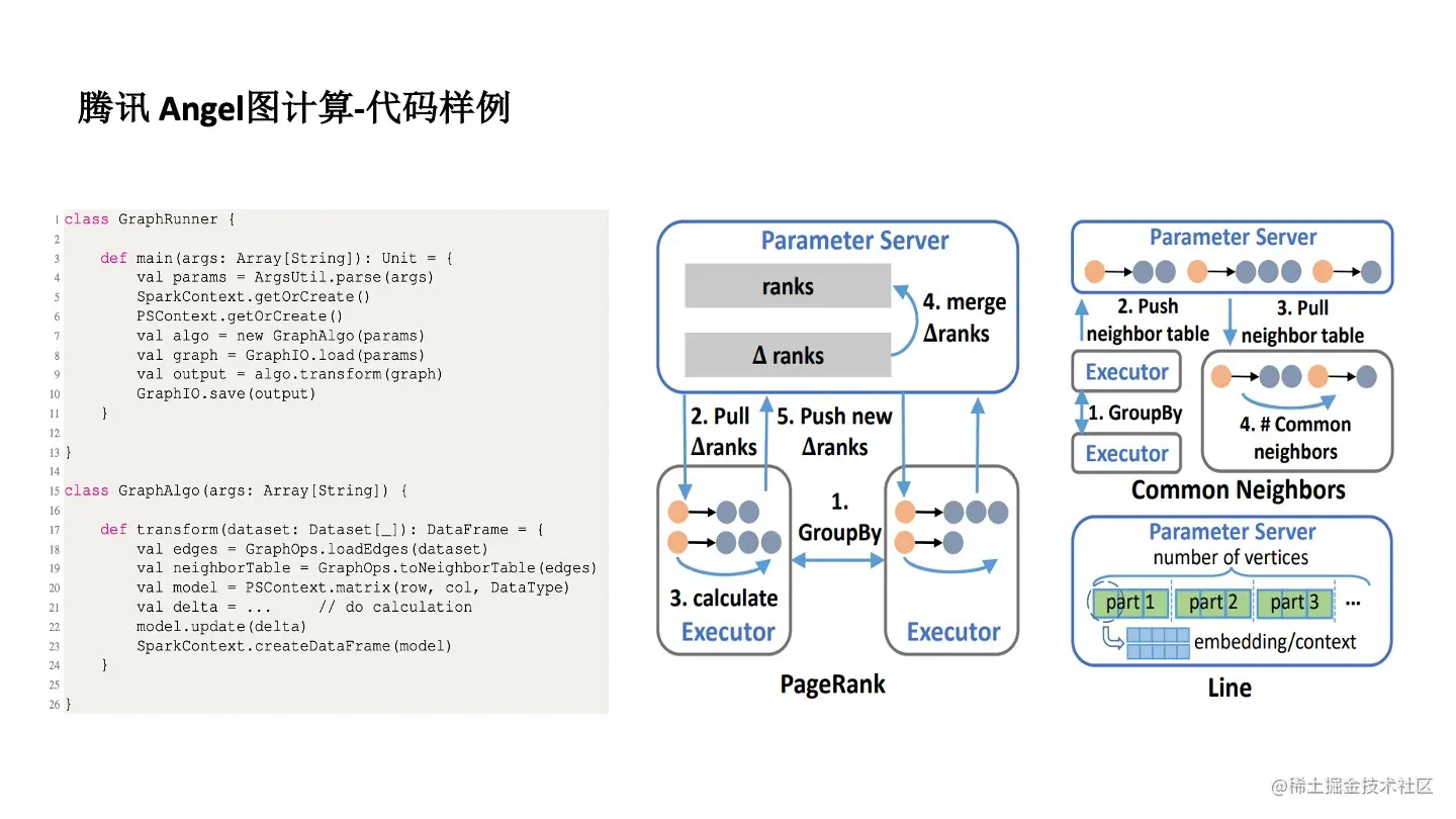 首先,图很难实现分布式及分布式管理。为了解决这个问题,Angel 用了 Parameter Server 框架去实现。对于不同的算法,比如 PageRank 要把每个点的向量作为参数存起来,然后再进行分布式计算。在分布式计算的时候,采用了 Spark 计算的原理,一个 Spark 程序有很多的 Executor 来实现分布式计算。也从某种程度上解决了算法同学编程难的问题。