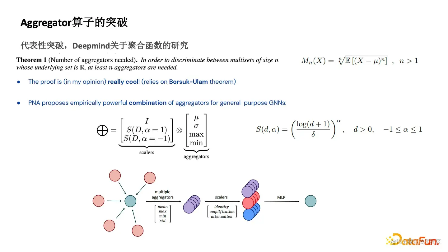 为解决这个问题,Deepmind 设计了一种新型的 Aggregator 算子, N 个 Moments 对应着 N 个 Aggregator 算子。后面加了一个 Scalers, 下面的 Sigma 相当于是整合度的总和。d 就是这个点的度,Alpha 是一个系数,Alpha 有 1 又有 -1。