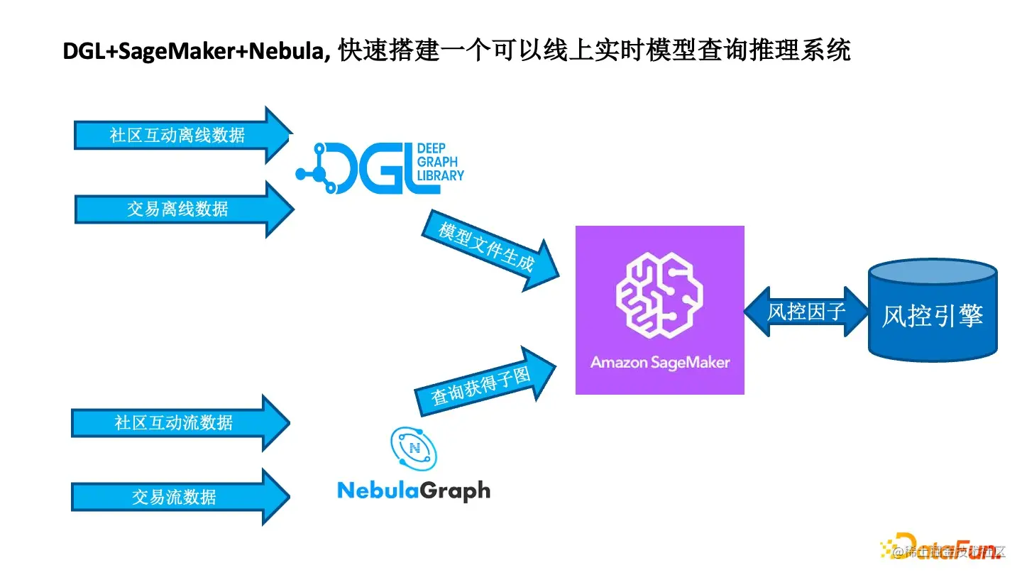 金融支付防范实时风险可以用大厂的开源工具去实现。比如使用 DGL 实现模型实时推理;离线模型使用社区、交易数据训练,产生模型文件。