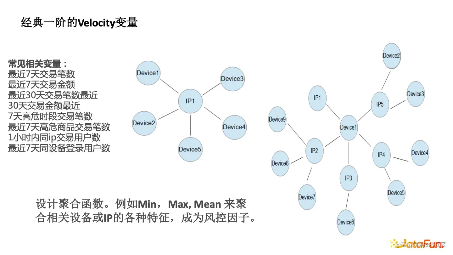 - Mean 函数,如周围的设备平均的交易数。之前风控从业者通过手工去设计这个一阶的 Aggregate,通过图算法能从一阶到两阶。