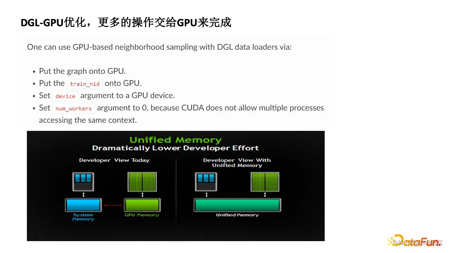 DGL 的底层也做了一些优化。因为基于 Spark,有一个问题就是 Aggregate 到 Send 过程会有很多额外的通讯和存储的开销。优化的方式是把该过程变成了矩阵的计算,然后再用到 GPU 优化的特性去完成,所以编程难度有所降低,效率上有很大的提高。