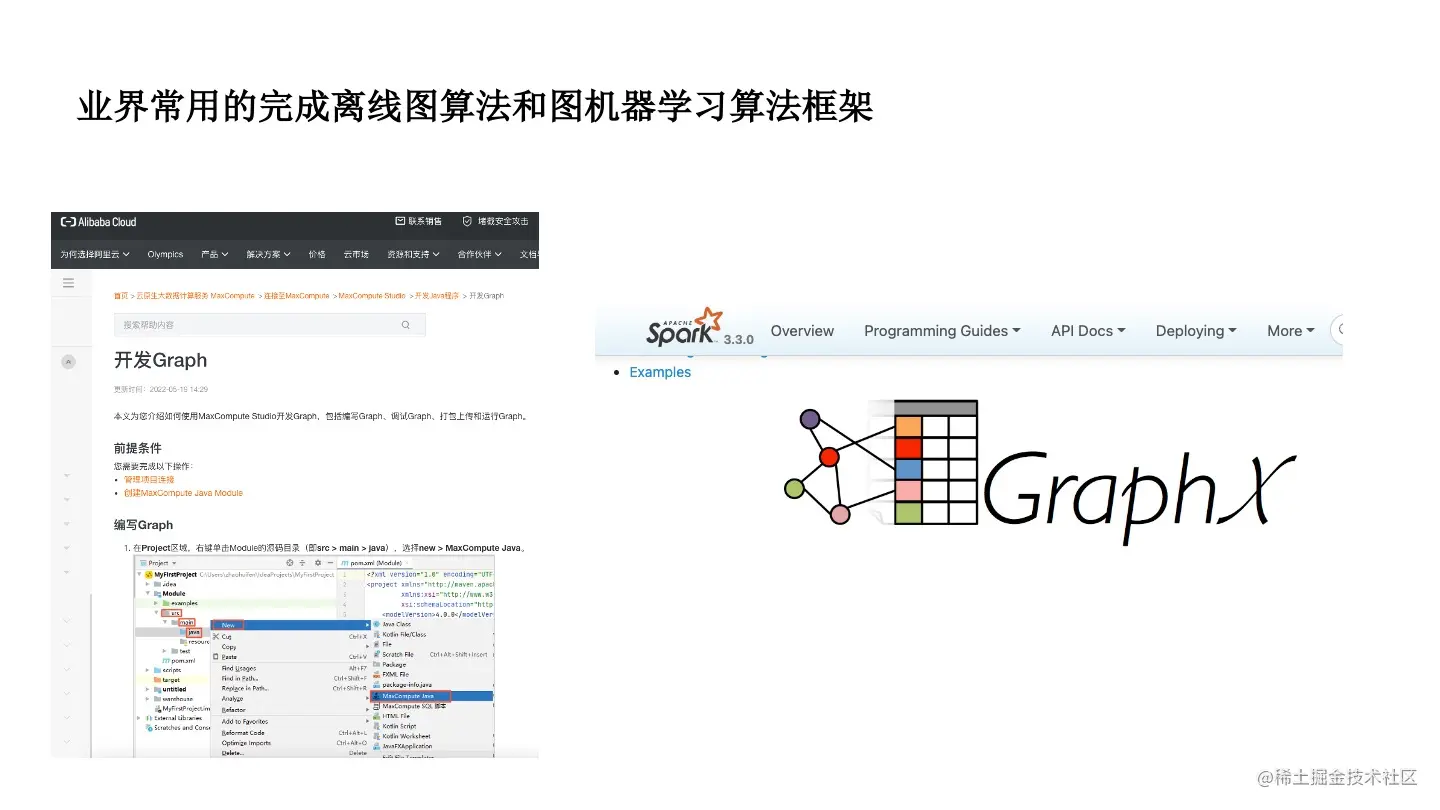 早期尝试去做图的时候,主要是做图的最短路径,单机版很简单。在大厂数据量很大,会使用分布式的图学习。首先是思维的转变,传统的图算法,都是 Sequency 的结构,很少有迭代式或者分布式。在 Message Passing 的框架下,代表有阿里的 ODPS Graph、Spark GraphX,背后的框架都用的是谷歌的思想,第一次把图算法的思路转化成以点为中心,和周围的点去做通信。