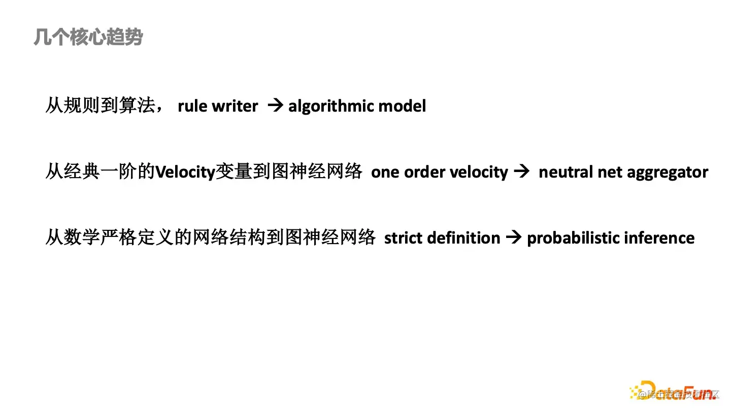 早年间风控尤其是风控策略,更多的是一个 Rule Writer。通过业务理解写规则,慢慢演化成算法模型。还有从经典一阶的 Velocity 变量变成了 Neutral Net Aggregator(后面会细讲)。传统的风控算法或规则只能看到相邻点的特征,现在可以通过神经网络计算 Aggregator。这也是从数学严格定义的网络结构到图神经网络、Strict Definition 到概率化的推断的演进过程。