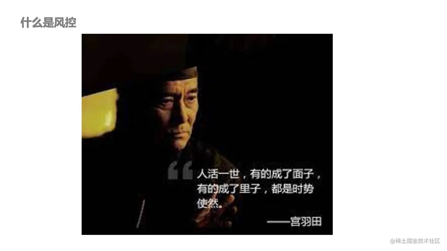 上图中的台词很好地概括了风控的工作,“人活一世,有的人成了面子,有的人成了里子,都是时势使然”。从事金融风控、交易风控,风控规则和算法是公司的核心竞争力,都需要保密。有很多精彩的算法及落地不方便出来交流,可能很少有人知道,但这都成了里子。风控同学也是甘于寂寞,不断地去进行各种对抗,同时也在钻研技术和业务。
