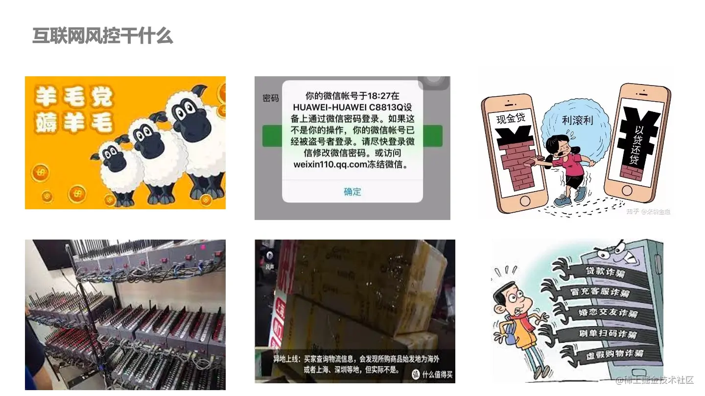 众所周知的羊毛党薅羊毛、账户被盗、盗卡、现金贷、“以贷养贷”、猫池、恶意退货、物流空包、各种各样的诈骗、杀猪盘等等,这些场景都属于互联网风控范畴。