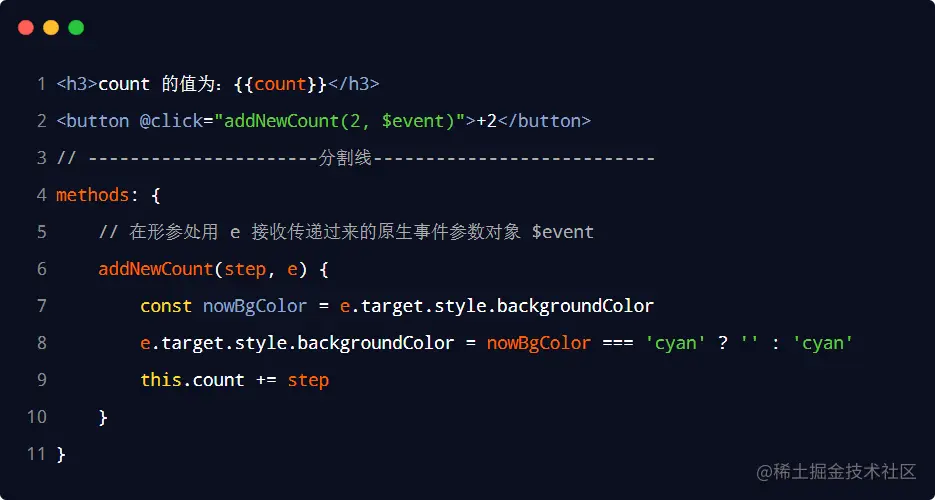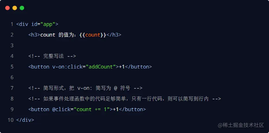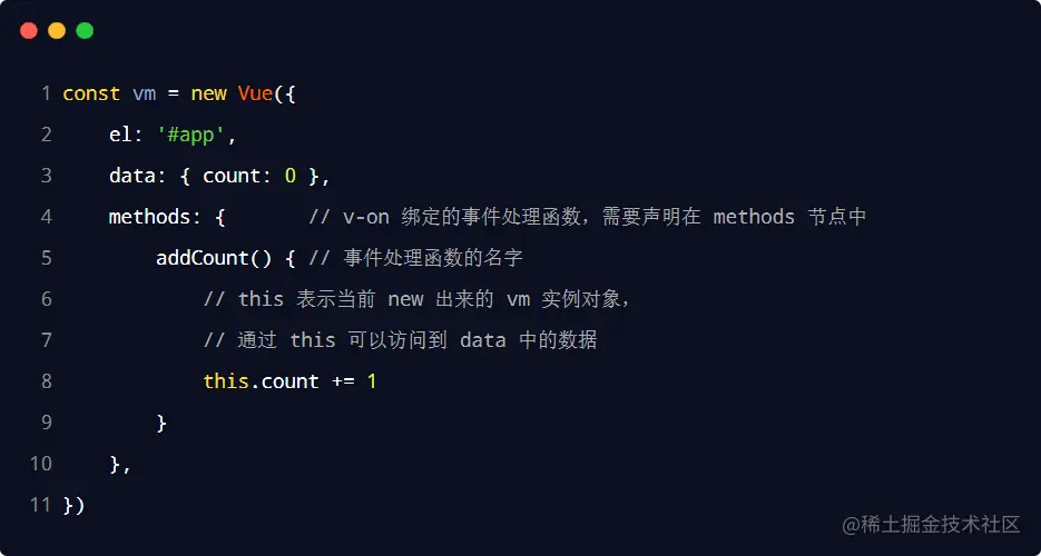 注意:原生 DOM 对象有 onclick、oninput、onkeyup 等原生事件,替换为 vue 的事件绑定形式后,