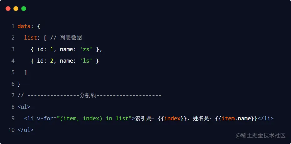注意:v-for 指令中的 item 项和 index 索引都是形参,可以根据需要进行重命名。例如 (user, i) in userlist
