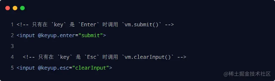 在监听键盘事件时,我们经常需要判断详细的按键。此时,可以为键盘相关的事件添加按键修饰符,例如: