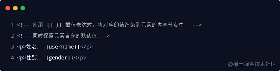 vue 提供的 {{ }} 语法,专门用来解决 v-text 会覆盖默认文本内容的问题。