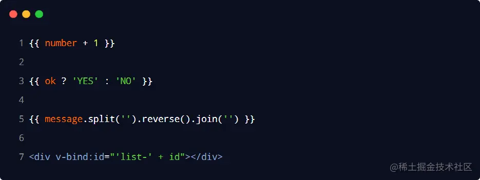 在 vue 提供的模板渲染语法中,除了支持绑定简单的数据值之外,还支持 Javascript 表达式的运算,例如: