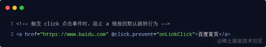 | .prevent | 阻止默认行为(例如:阻止 a 连接的跳转、阻止表单的提交等) |