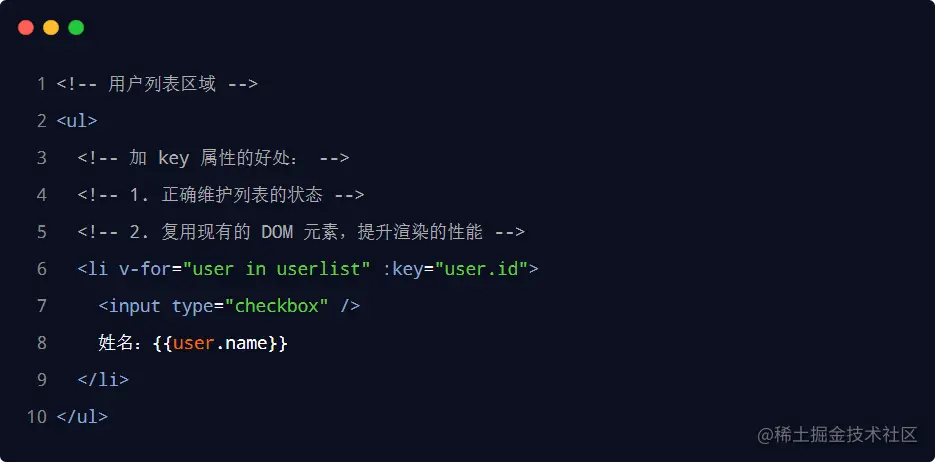 为了给 vue 一个提示,以便它能跟踪每个节点的身份,从而在保证有状态的列表被正确更新的前提下,提升渲染的性能。此时,需要为每项提供一个唯一的 key 属性: