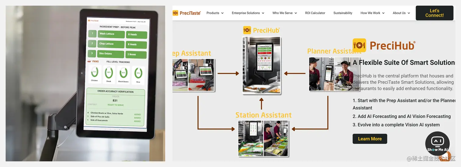 PreciTaste 是一个按需烹饪的 AI 厨房管理系统,可以监控食材数量与新鲜程度,提醒员工何时开始烹饪,同时自动为每家餐厅实时更新生产计划,能够为顾客提供最新鲜的餐食并最大限度地减少食物浪费。