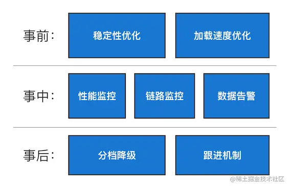 下面这张图简要阐述了雪球分别在「事前」、「事中」、「事后」针对跨端技术做的高可用建设: