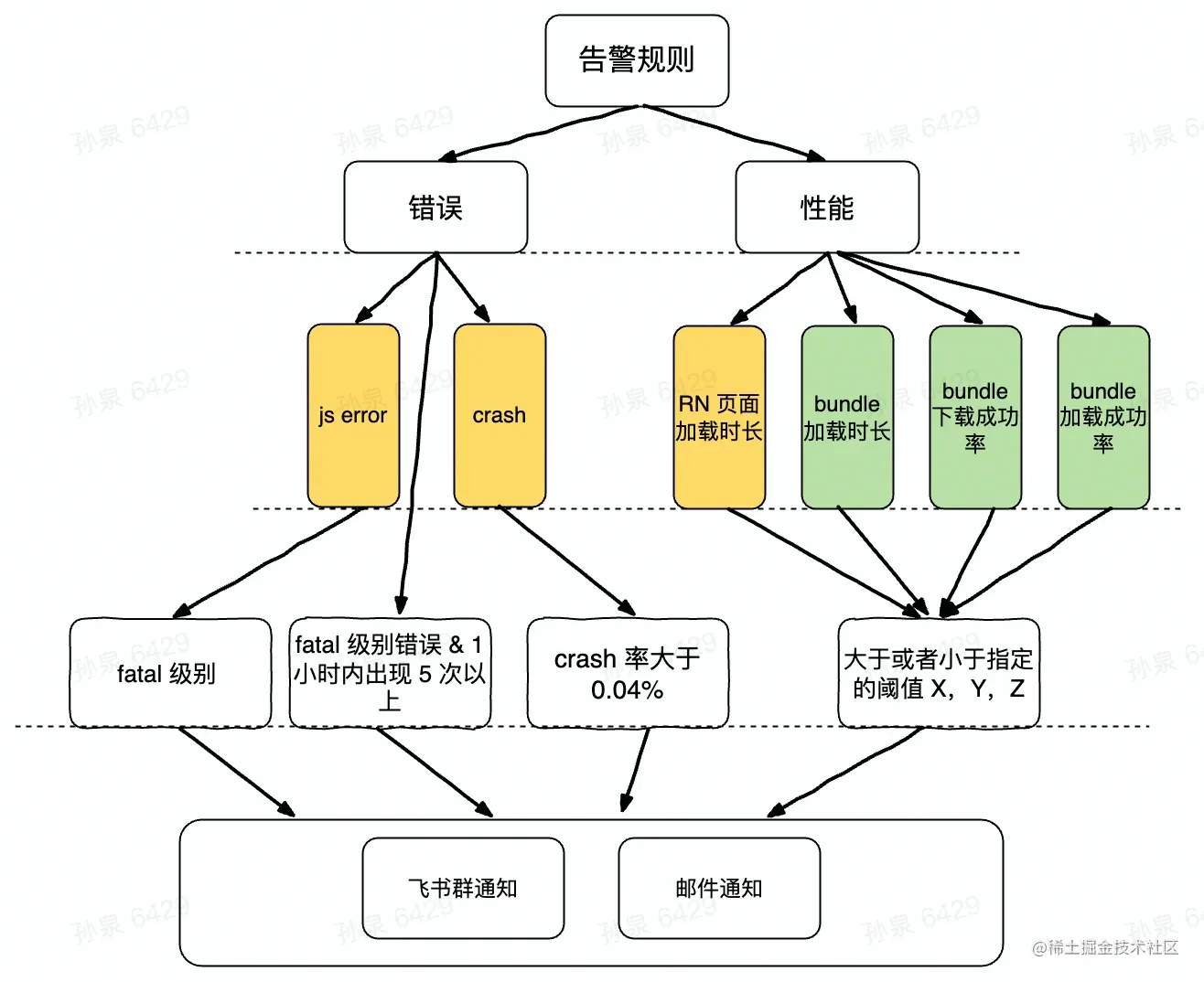 雪球通过配置飞书机器人实现监控平台和飞书群的联动,从而达到监控数据达到阈值之后的自动告警和开发的快速跟进,大大提升了大前端的协作效率,全链路告警机制如下图所示: