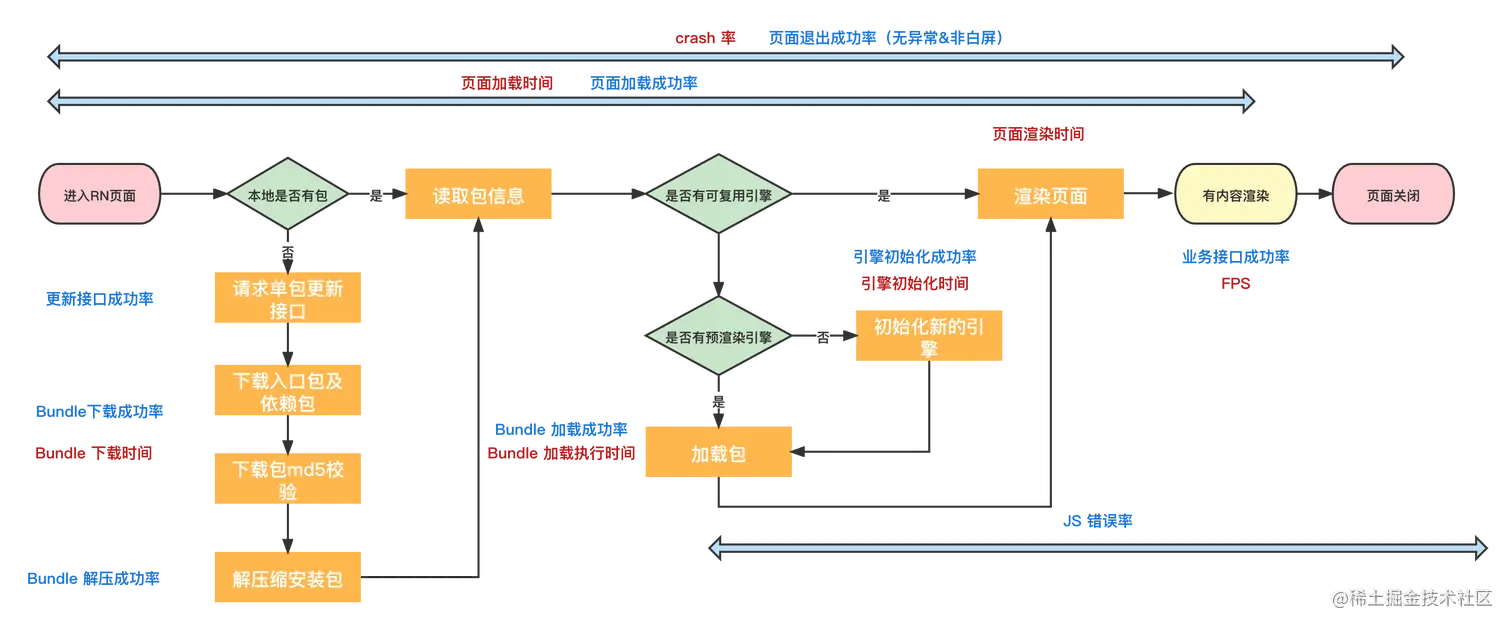 如上所示,关键的性能指标包括:Bundle 下载、解压及加载情况、页面流畅性、页面加载时长、crash 、JS 错误、白屏等。为了统计这些关键的性能指标,我们把监控过程拆分为两个阶段——「进入 RN 页面前」和「进入 RN 页面后」: