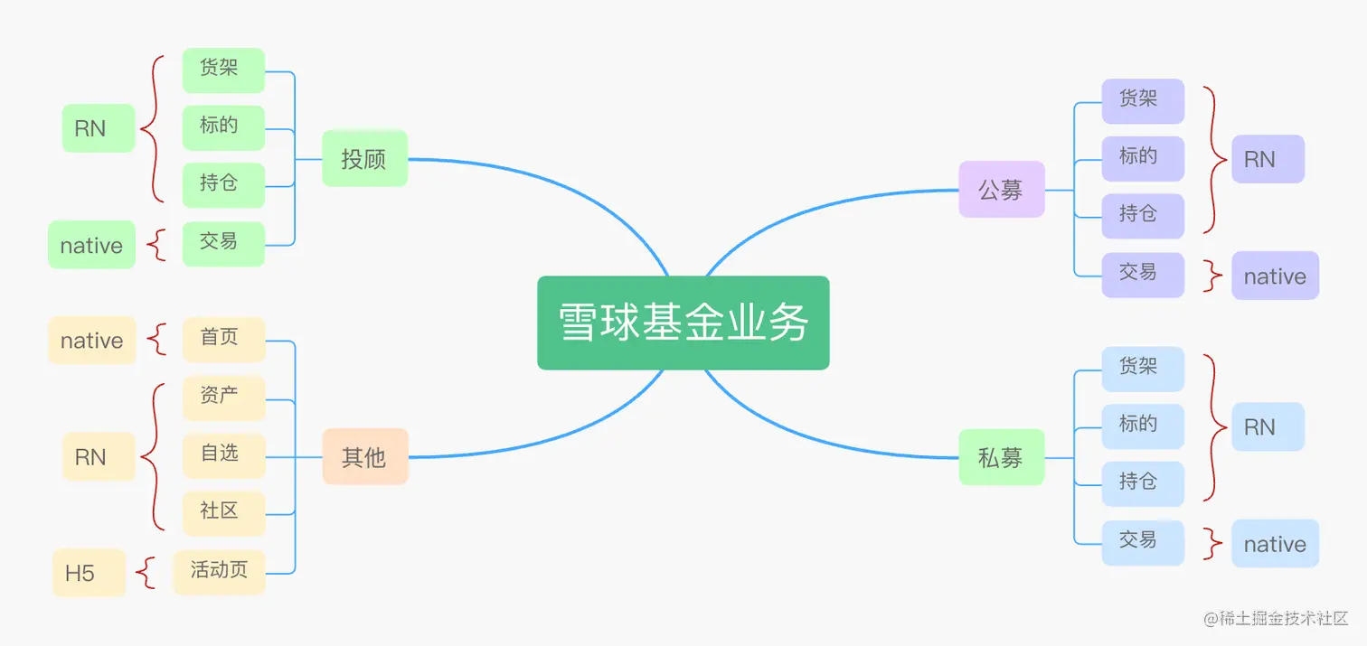 以基金业务为例,主要包括投顾、公募、私募、社区等模块。社区业务较为简单,新增的页面优先进行 RN 开发;私募页大部分为 H5/RN 开发,Native 页面涉及的较少,考虑到迁移的风险较低,也可以优先替换私募页 H5 部分页面;投顾业务较为独立,同时和其他业务耦合度较低,建议可以从投顾头部页面(例如货架页)开始迁移;证券、股票、行情等业务较为复杂,迁移的优先级最低。