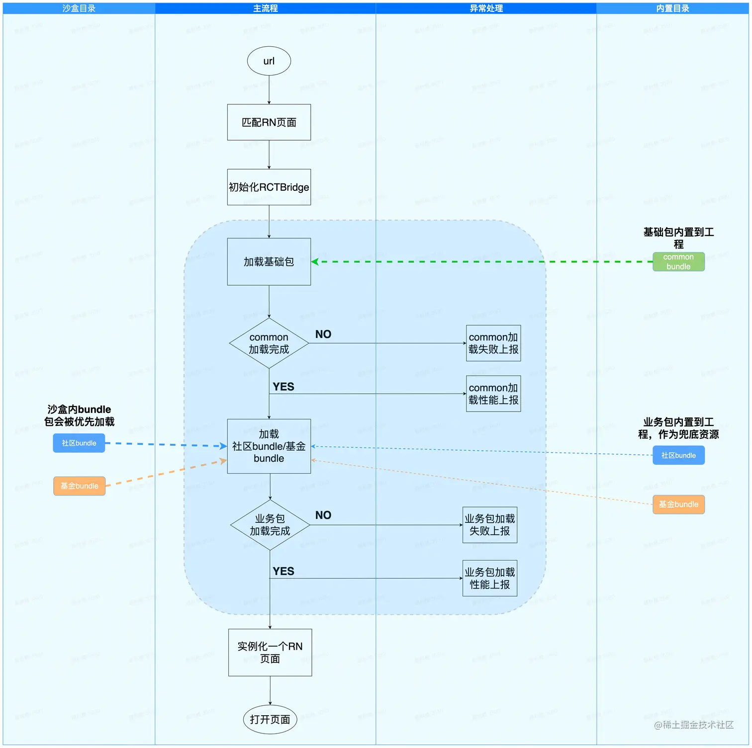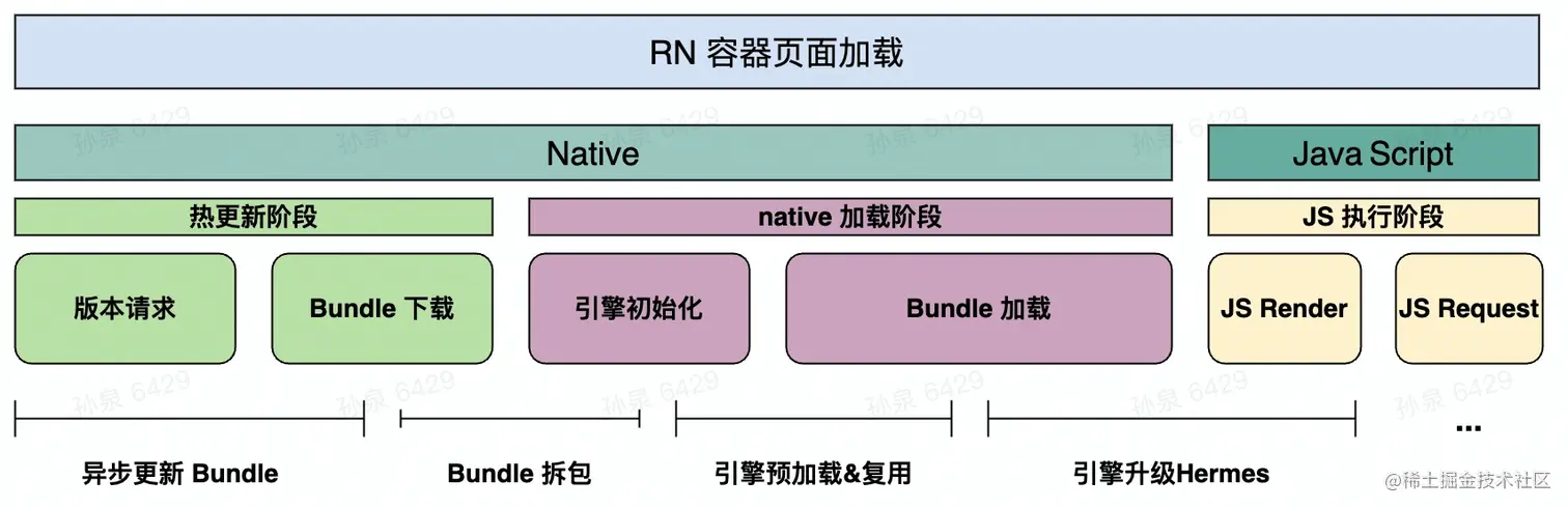 可以看出,一个 RN 页面的主要加载流程包括:版本请求、Bundle 下载、React Native 框架 Native 部分的初始化、React Native 框架 JS Bundle 的初始化、业务的数据请求、以及最终的业务渲染。