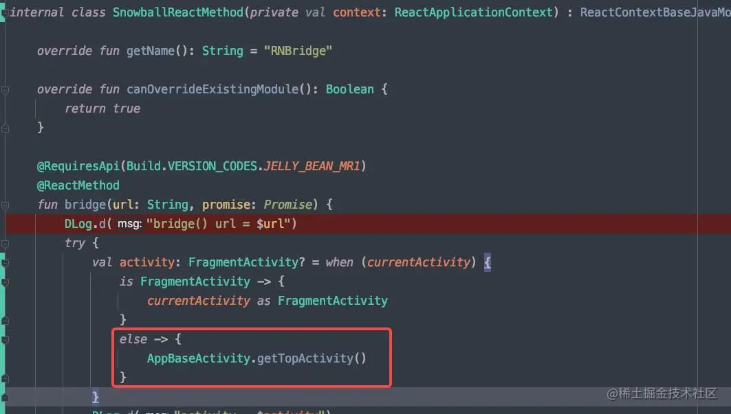 在 bridge 执行时页面(SnowballReactNativeActivity)已经打开, Fragment 中 onCreateView 已经执行, 所以当前的 activity 一定是存在且不会为空;所以这里没有必要用 RN 框架里面的 Activity,它初始化时机较晚,我们可以自己实现去获取当前 Activity 的逻辑,代码如下: