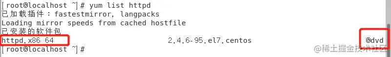 如图所示,卸载了httpd,查询http程序安装情况在库名前没有了@,httpd变为可安装的软件包。