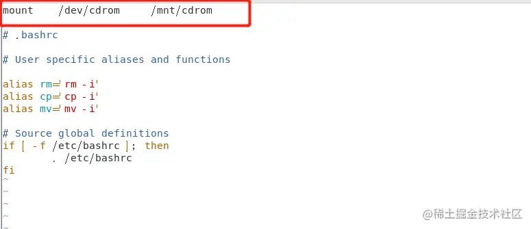 一直用的都是临时挂载,为了防止系统出错先不学习永久挂载,但是有个方法可以关机自动挂载,将挂载命令卸载.bashrc中,开机的时候系统会自动运行里面的命令。