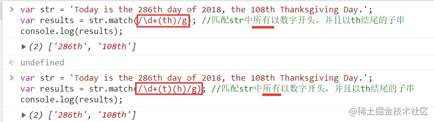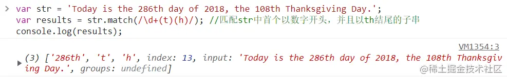 但当正则表达式改为: /\d+(t)(h)/ ,匹配到的项就有3个,分别是 '286th'、't'、'h'