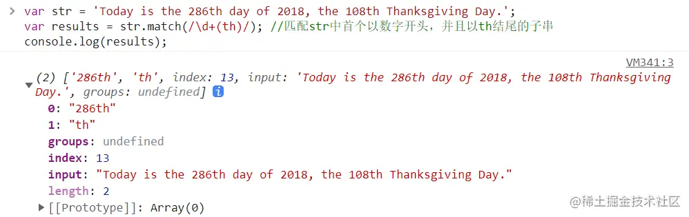 该正则表达式为: /\d(th)/ ,该表达式中使用了小括号(),在此次的作用为分组。所以match()的结果是带有分组特征的。返回的数组包含多个元素,第一个元素是以贪婪模式找到的最长的匹配,之后的元素一次为该匹配中的第一、第二、第三...个分组,这里只有一个分组,所以也就只匹配到一个分组结果,也就是'th'。