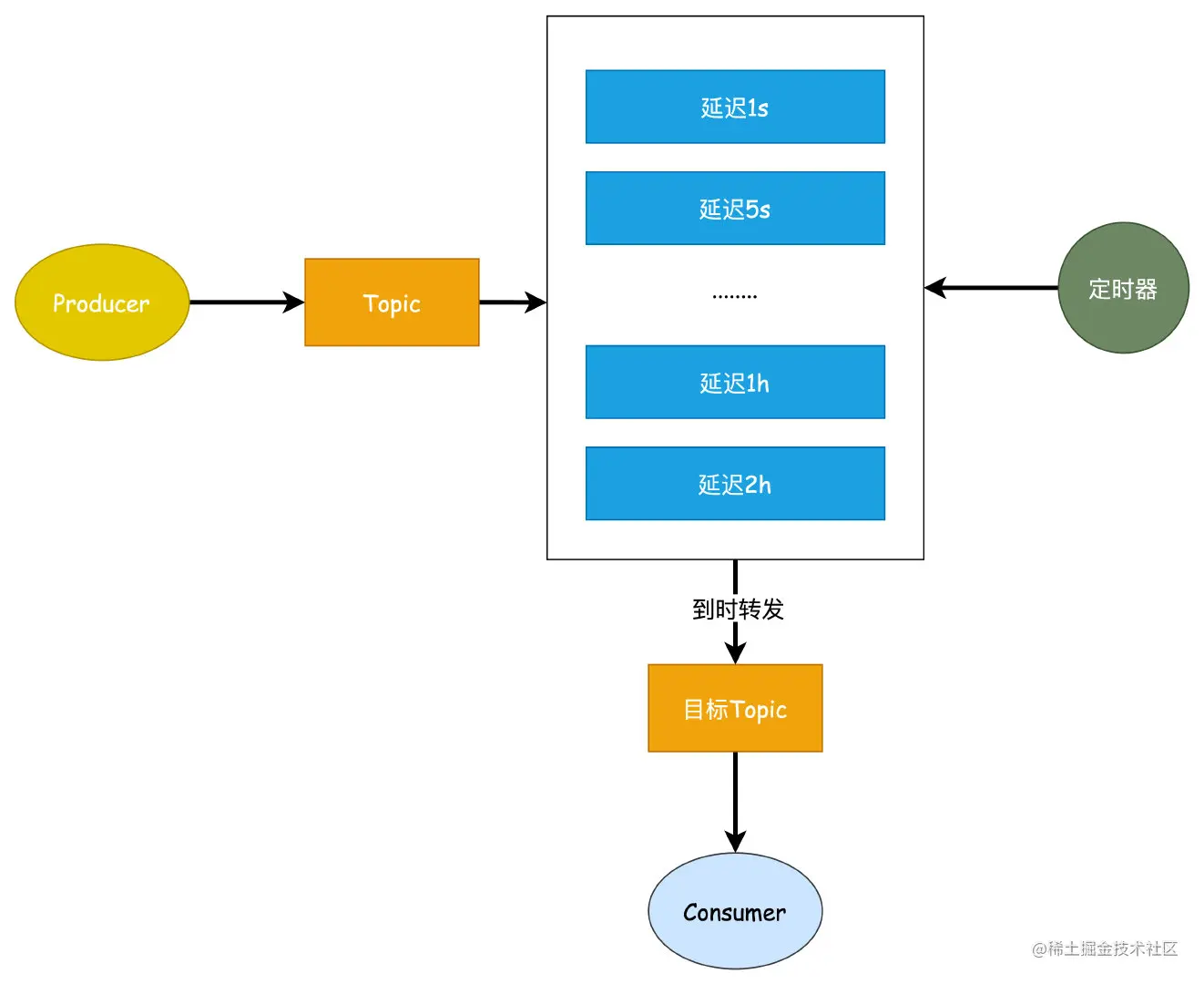 谈到这里就顺便提一下关于消息消费重试的原理,这个本质上来说其实是一样的,对于消费失败需要重试的消息实际上都会被丢到延迟队列的 topic 里,到期后再转发到真正的 topic 中。