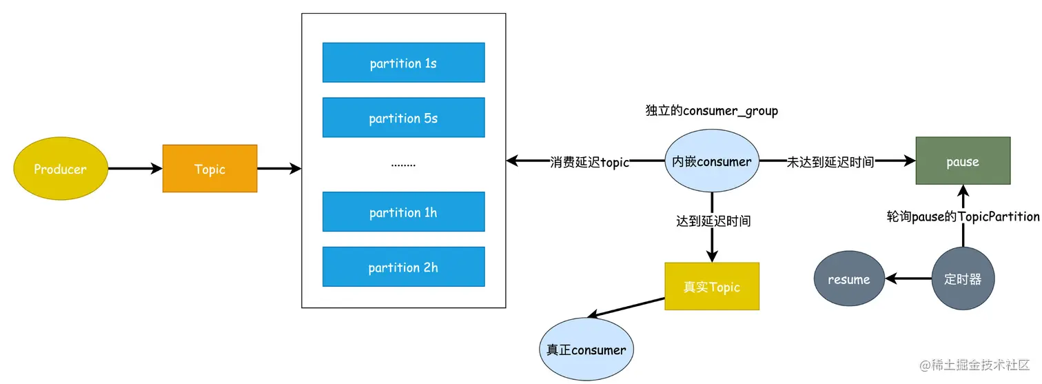 consumer单独设置一个ConsumerGroup去消费延迟 topic 消息,消费到消息之后如果没有达到延迟时间那么就进行pause,然后seek到当前ConsumerRecord的offset位置,同时使用定时器去轮询延迟的TopicPartition,达到延迟时间之后进行resume -