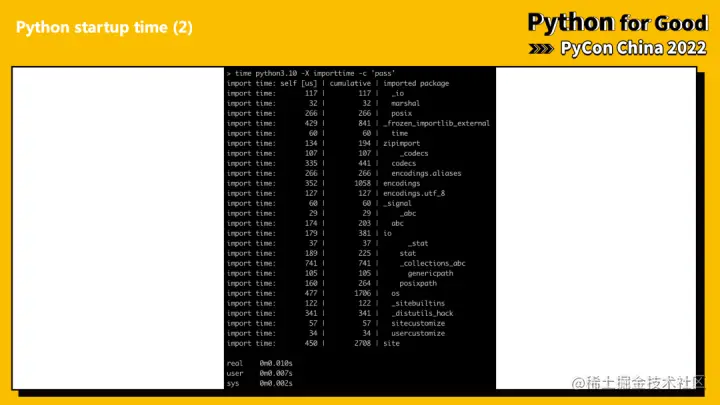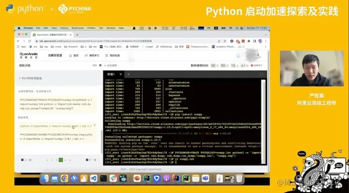 编者按:在刚刚结束的 PyCon China 2022 大会上,龙蜥社区开发者严懿宸分享了主题为《Python 启动加速的探索与实践》的技术演讲。本次演讲,作者将从 CPython 社区相关工作、本方案的设计及实现,以及业务层面的集成等方面进行介绍。
