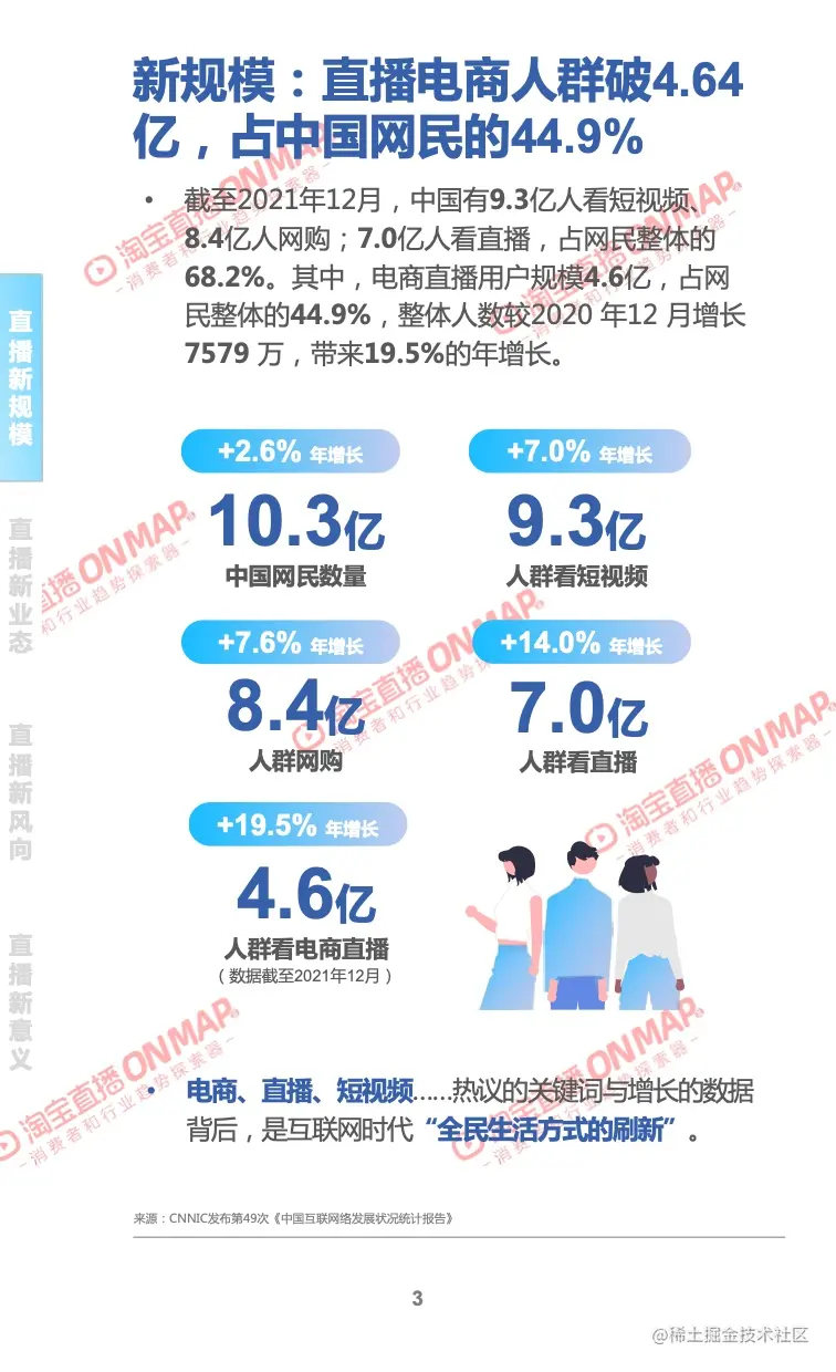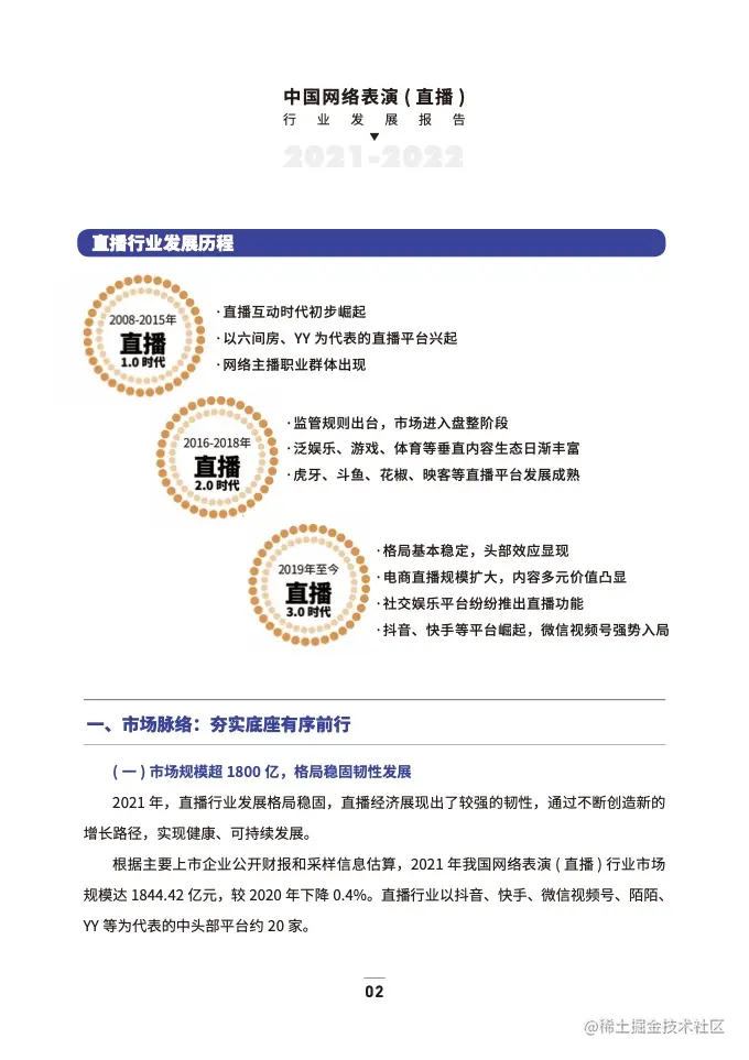 《中国演出行业协会:2021-2022年中国网络表演(直播)行业发展报告》认为直播行业成长至今已进入3.0时代,行业格局基本稳定,经济价值、社会文化价值与日俱增,新的内容和消费场景不断激活。