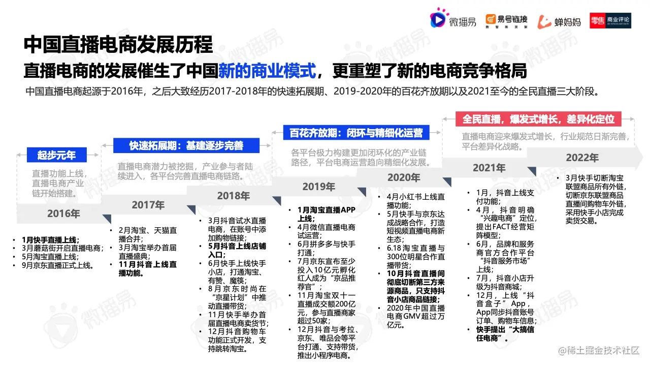 中国直播电商起源于2016年,之后大致经历2017-2018年的快速拓展期、2019-2020年的百花齐放期以及2021至今的全民直播三大阶段。(报告列表见文末)